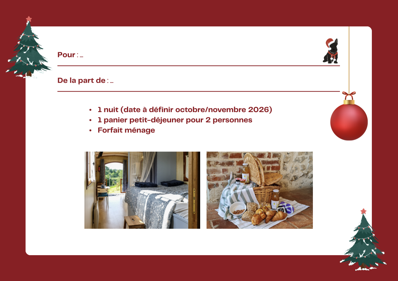 Nous proposons des bons cadeaux personnalisés pour une ou plusieurs nuits, en gîte ou en roulotte.